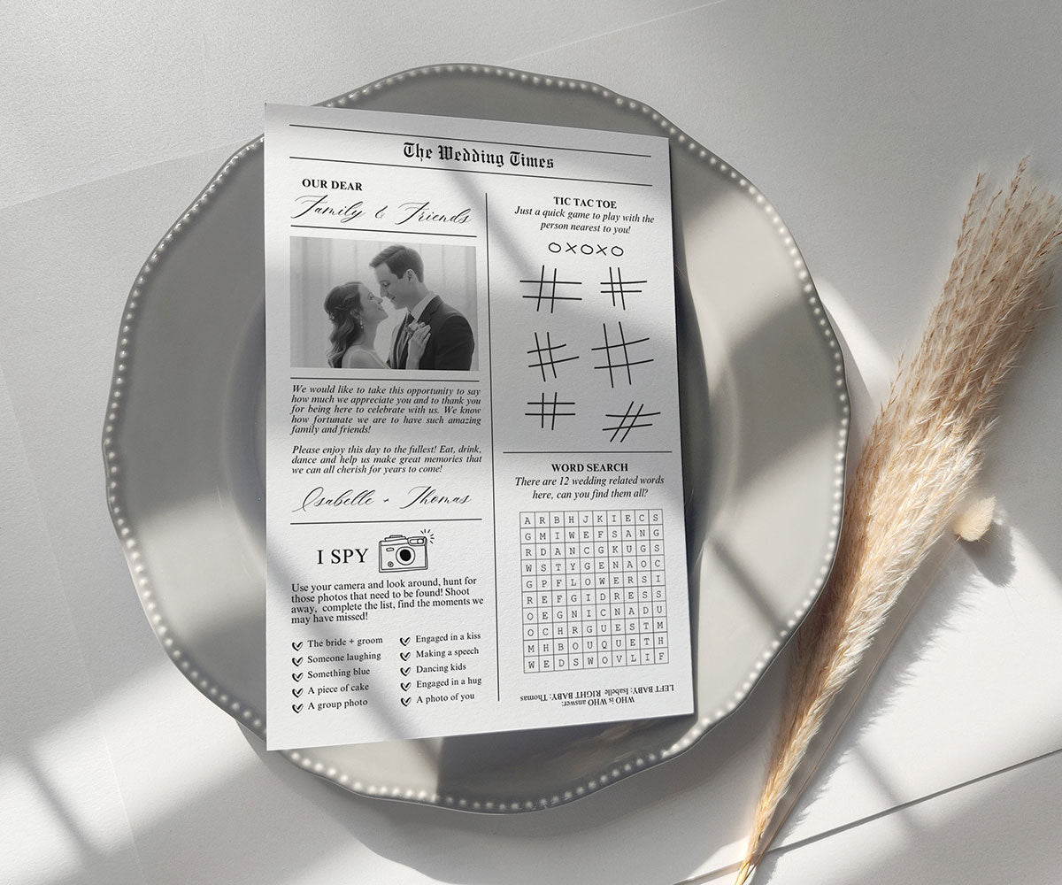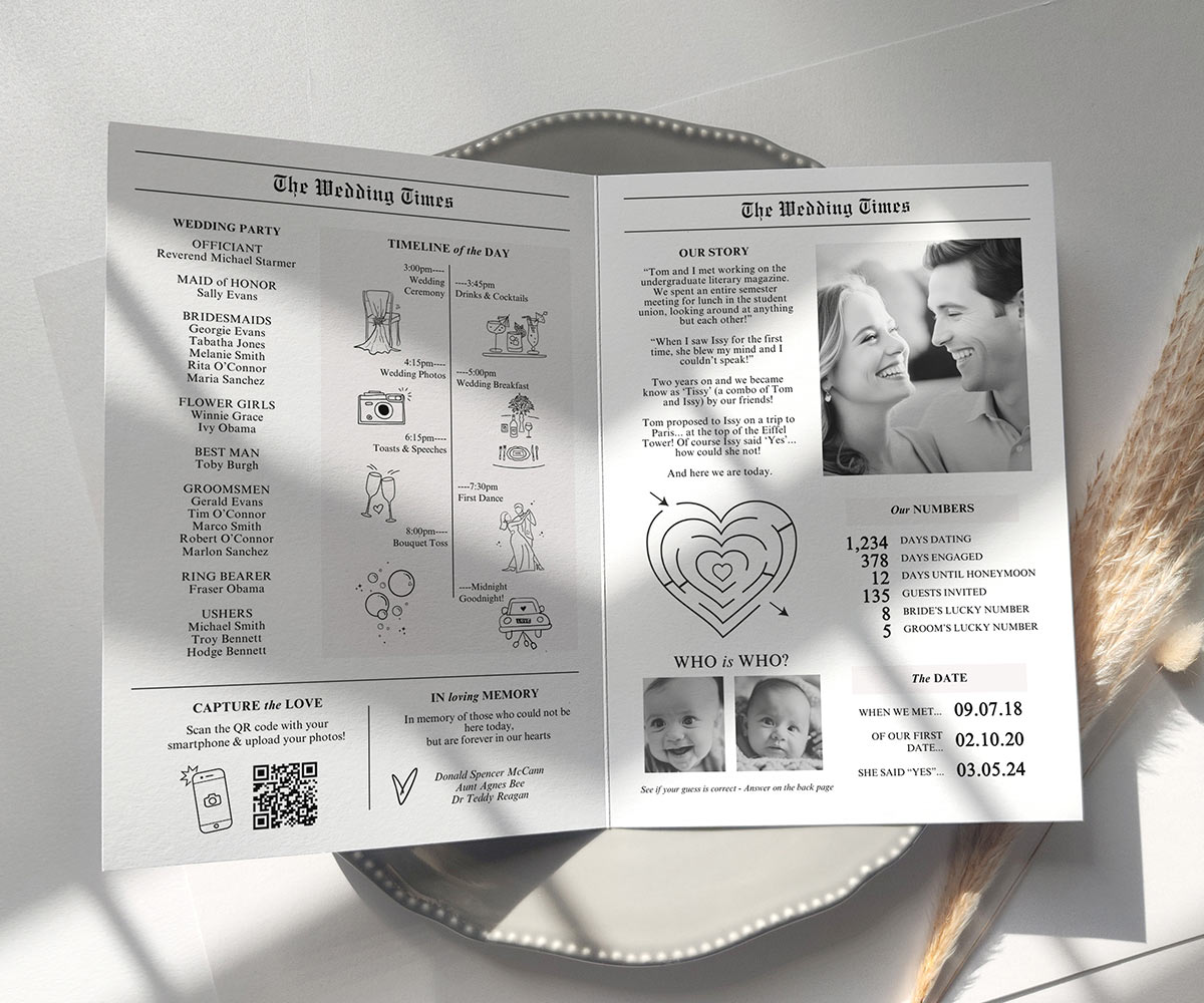 Folded Newspaper Wedding program. A fun and informative wedding program, uniquely personalised for your special day!