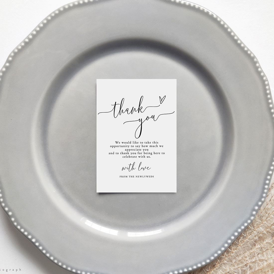 2.9x4.1" Use these thank you cards on place settings or with wedding favours. Printed on smooth white card.