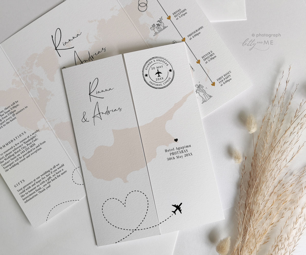 ★ With the map of Cyprus on the front and a heart or other icon marking the location of your wedding. These invitations include an outline of the important information on one side and my hand drawn illustrations on the other panel. The illustrations nicely summarise the timeline of your wedding day (with or without exact timings).