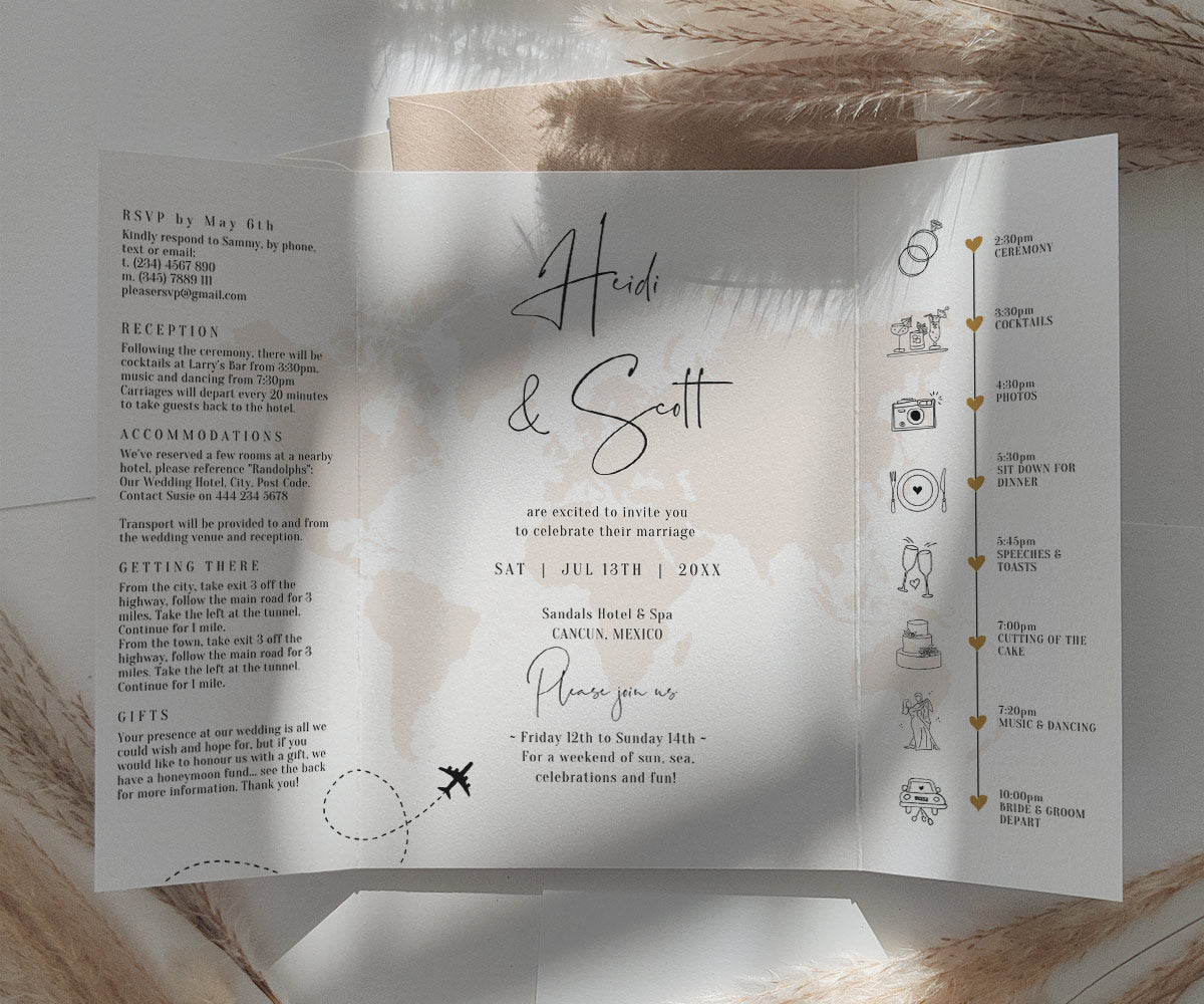 ★ With a beautiful greenery design on the front and your names in a gorgeous script font, the foliage is carried through to the central part of the invitation. These invitations include an outline of the important information on one side and my hand drawn illustrations on the other panel. The illustrations nicely summarise the timeline of your wedding day (with or without exact timings).