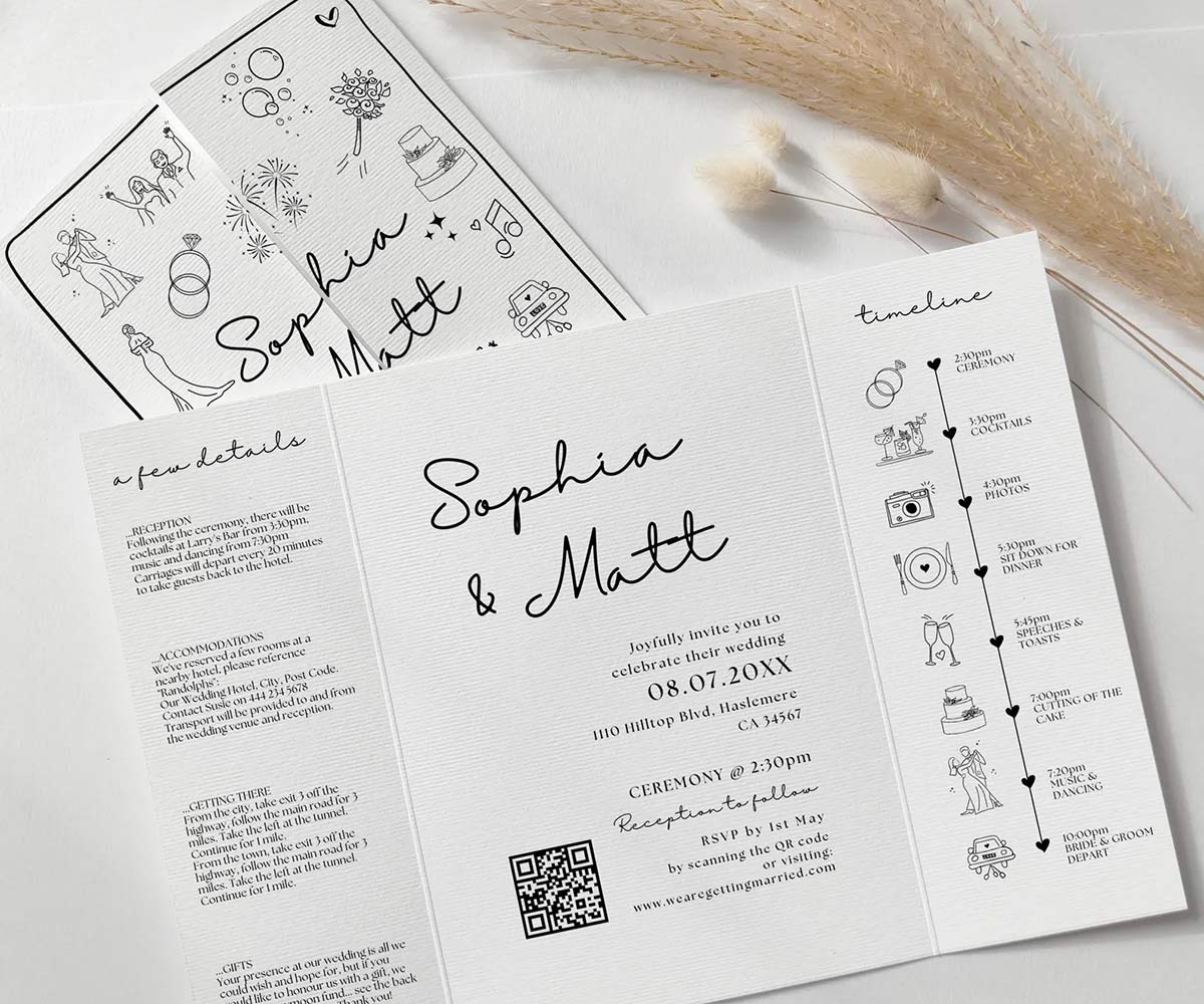 ★ Perfect for a minimalist style or black and white wedding theme. These invitations include an outline of the important information on one side and my hand drawn illustrations on the other panel. The illustrations nicely summarise the timeline of your wedding day (with or without exact timings).
