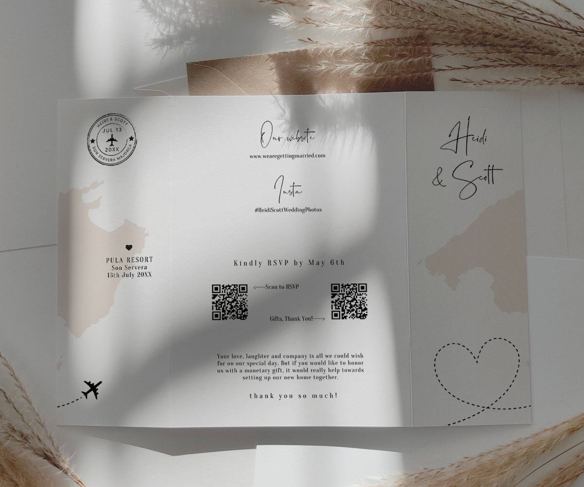 The QR code on the inside is useful for guests to scan and quickly respond to your invitation. If required, I can create QR codes for you (complimentary). The QR code used for RSVPs would link either to your email address or to your wedding website.