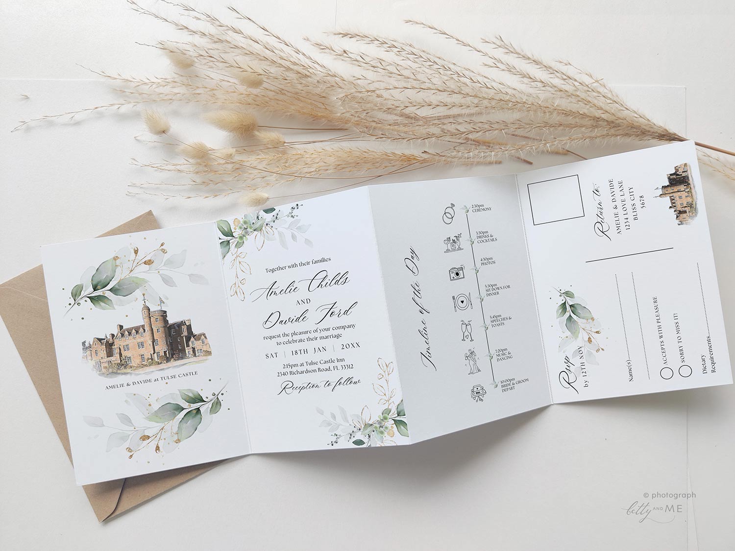 ★ Featuring a unique and custom watercolour sketch of your wedding venue (created complimentary for you), and framed by a gorgeous greenery design. These invitations include an outline of the important information on one side and my hand drawn illustrations on the other panel. The illustrations nicely summarise the timeline of your wedding day (with or without exact timings).