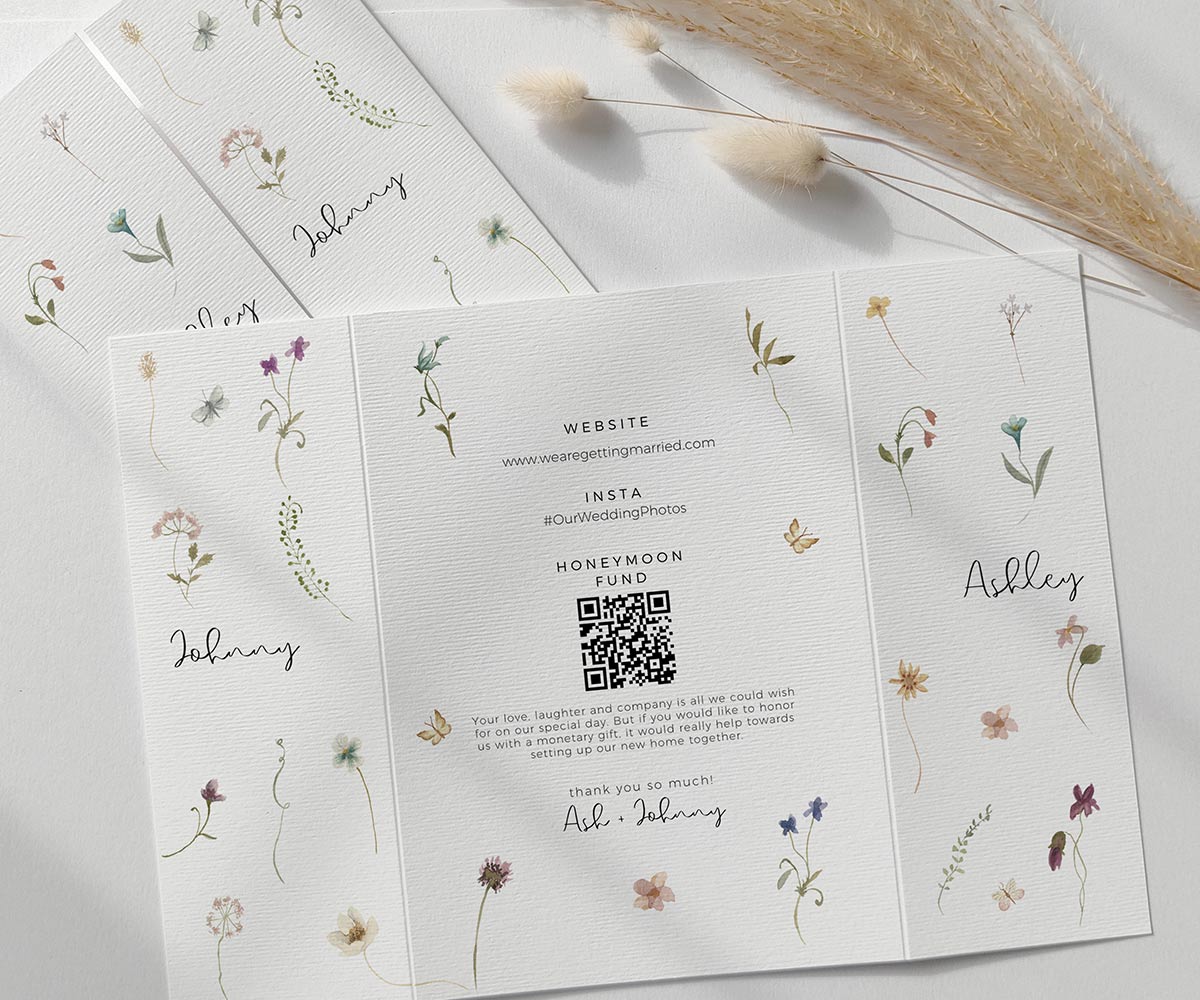 The back of the invitation can include any additional information amongst wildflowers - for example we can add a QR code for shared photo / video albums, or for RSVPs, for your wedding website, for Honeymoon funds (Venmo, PayPal etc), or for linking to a gift registry.