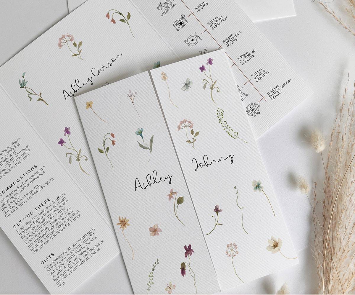 ★ Your names in a gorgeous script font, surrounded by lovely watercolour wildflowers, and the flowers are carried through to the central and back of the invitation. These invitations include an outline of the important information on one side and my hand drawn illustrations on the other panel. The illustrations nicely summarise the timeline of your wedding day (with or without exact timings).
